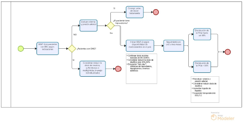La declaración de consenso de expertos para los países de Asia y el Pacífico [46], publicada en 2023, especifica que en pacientes con ERC puede ocurrir una disminución inicial de la TFGe, lo cual no se correlaciona negativamente con el uso de los medicamentos, además, recalca la importancia de reducir o suspender los diuréticos, prevenir la depleción de volumen y evitar la administración de medicamentos nefrotóxicos o de medios de contraste, para minimizar la reducción inicial de la TFGe antes del tratamiento. La suspensión de los medicamentos se recomienda realizarla 72 horas antes de una cirugía programada, procedimientos invasivos planificados o cuando se realice actividad física exagerada, siendo posible retomarlos una vez que el paciente se estabilice y no tenga riesgo de desarrollar cetoacidosis. La suspensión inmediata está indicada en los casos en que se deba realizar una cirugía de emergencia o en situaciones de estrés extremo (ingesta insuficiente de calorías, infecciones graves, hipovolemia o enfermedad crítica).