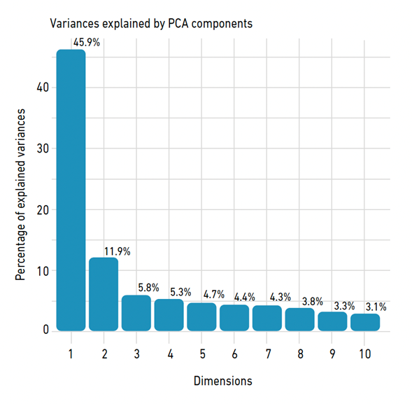PCA was performed to reduce the dimensionality of the dataset and identify the underlying patterns of variability. This analysis facilitated the identification of key variables contributing most to the variance in the data, thereby simplifying the subsequent clustering analysis. By transforming the data into a smaller number of uncorrelated components, PCA enhanced the interpretability of the GMM clustering.