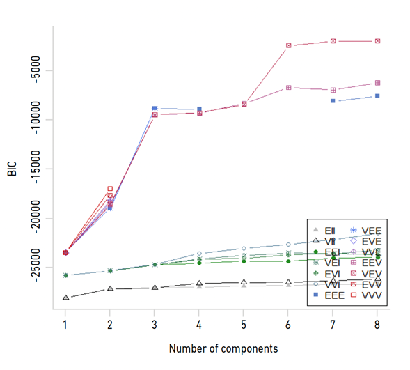 Abbreviations: EII, Spherical, equal volume; VII, Spherical, unequal volume; EEI, Diagonal, equal volume and shape; VEI, Diagonal, equal shape; EVI, Diagonal, equal volume; VVI, Diagonal, varying volume and shape; EEE, Ellipsoidal, equal volume/shape/orientation; EEV, Ellipsoidal, equal volume and shape; VEV, Ellipsoidal, equal shape; VVV, Ellipsoidal, varying volume/shape/orientation.