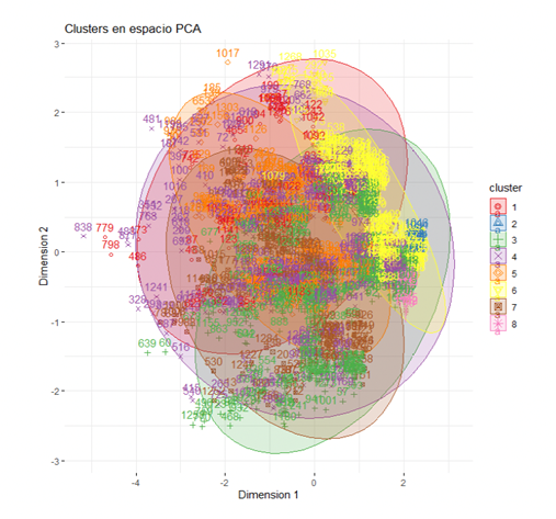 The largest cluster (Cluster 3) predominantly included older women, with a mean age of 66.5 years, who had lived with hypertension for at least a decade and generally belonged to a high socioeconomic stratum. Cluster 8 had the youngest participants (mean age = 59.1 years) and was characterized by a mid‑level socioeconomic profile. Cluster 7 concentrated the greatest proportion of individuals with uncontrolled hypertension, indicating that blood‑pressure management challenges are largely confined to this smaller cluster.