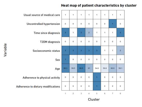 Notes: 1) Uncontrolled hypertension, T2DM diagnosis, adherence to physical activity, and adherence to dietary modifications are binary variables (0 = No, 1 = Yes); 2) Sex is a binary variable (0 = Female, 1 = Male); 3) For usual source of medical care, the code 1 denotes care provided by social‑security institutions; 4) Socioeconomic status was coded as 1 = Low, 2 = Middle, and 3 = High; and 5) Cluster sizes were as follows: 1 (𝑛 = 88), 2 (𝑛 = 24), 3 (𝑛 = 325), 4 (𝑛 = 312), 5 (𝑛 = 154), 6 (𝑛 = 241), 7 (𝑛 = 142), and 8 (𝑛 = 22).