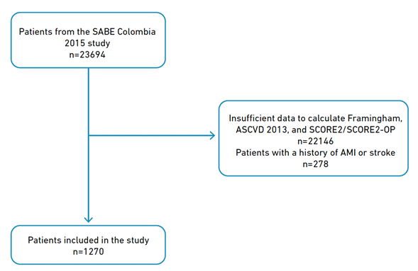 As reported in our previous research [8], out of the 23694 patients in the SABE Colombia 2015 study who were 60 years of age or older, 1270 patients were included in our study. The remaining 22,146 patients were excluded because they lacked the information necessary to estimate their CVR via SCORE2-OP, Framingham, ASCVD 2013, or SCORE2 calibrated for Colombia [12]. Additionally, 278 patients were removed because they had a history of acute myocardial infarction or stroke (Figure 1).