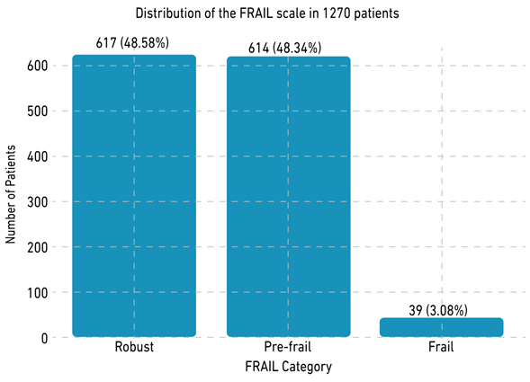 Among the 1270 patients, 60.79% (n = 772) were women, and 41.97% (n = 533) were mixed-race patients [8]. With respect to frailty, 48.58% (n = 617) were robust, 48.35% (n = 614) were prefrail, and 3.07% (n = 39) were frail according to the 5-Item FRAIL Scale [16-17] (Figure 2). Table 1 provides an extensive description of the sociodemographic characteristics of this population.